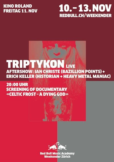 The concert will be preceded by the customary Red Bull Music Academy discussion session, held at the Lecture Room of Club Zukunft across the street from the Roland cinema and featuring Hellhammer/Celtic Frost/Triptykon singer/guitarist Tom Gabriel Warrior. The discussion will be hosted by journalist/author/publisher Ian Christe (Sound Of The Beast; Bazillion Points Books).